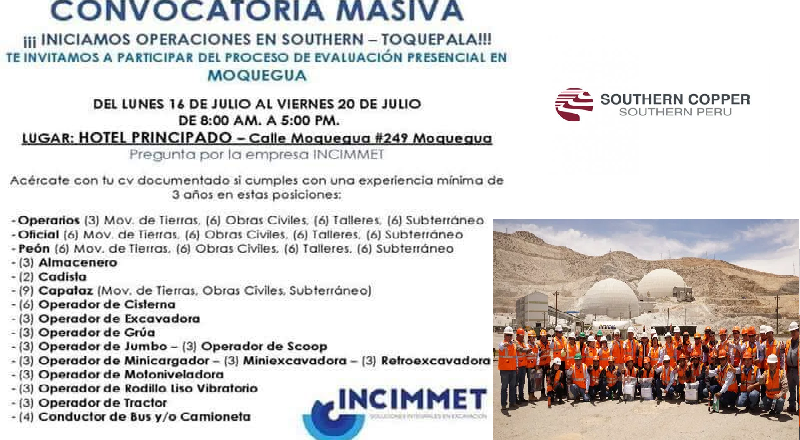 Nuevas Vacantes para trabajar en Southern Peru Copper Corporation 447 Plazas,Este trabajo fue emprendido en 1982 en el marco del proyecto «Minería y espacio económico